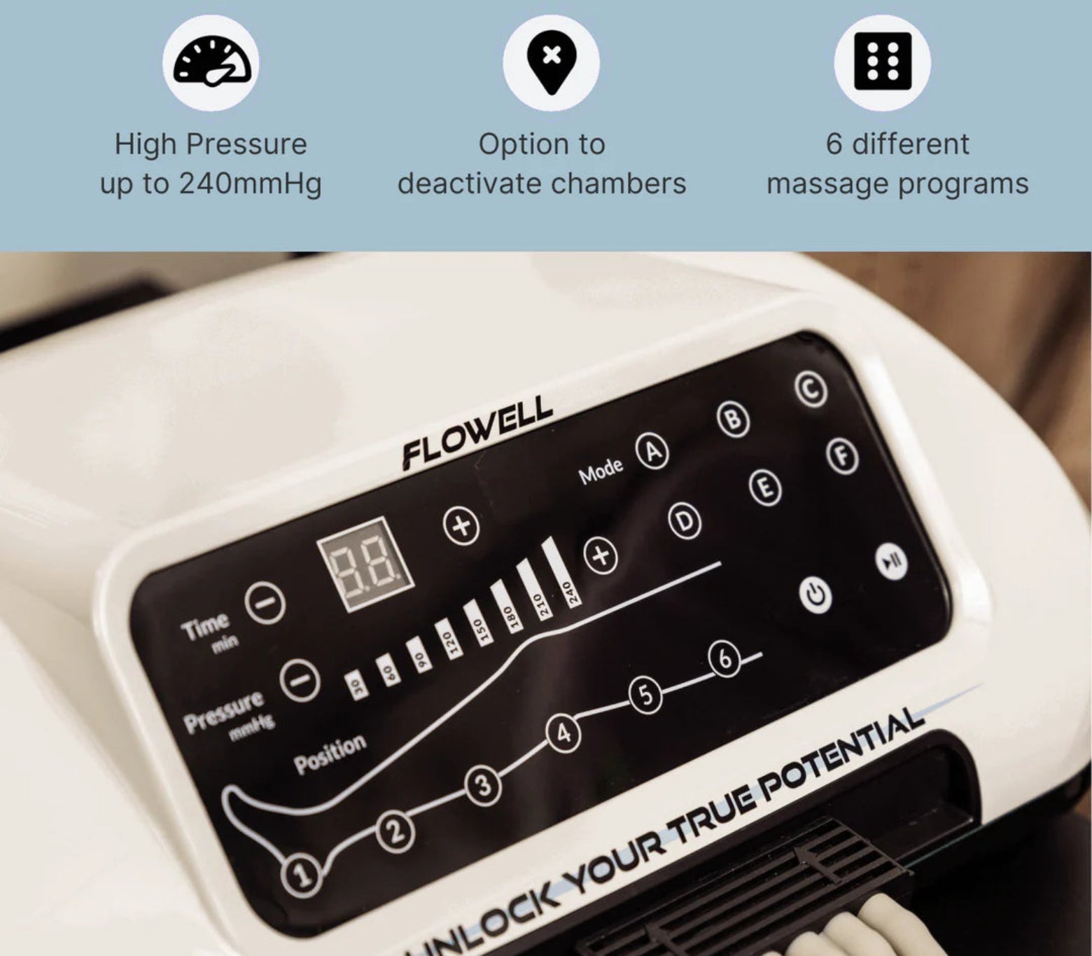 Featuring an 8-chamber design and 6 specialized programs, Flowell HOME Deluxe offers flexible applications, from lymph drainage to specific muscle and wave-like massage programs.